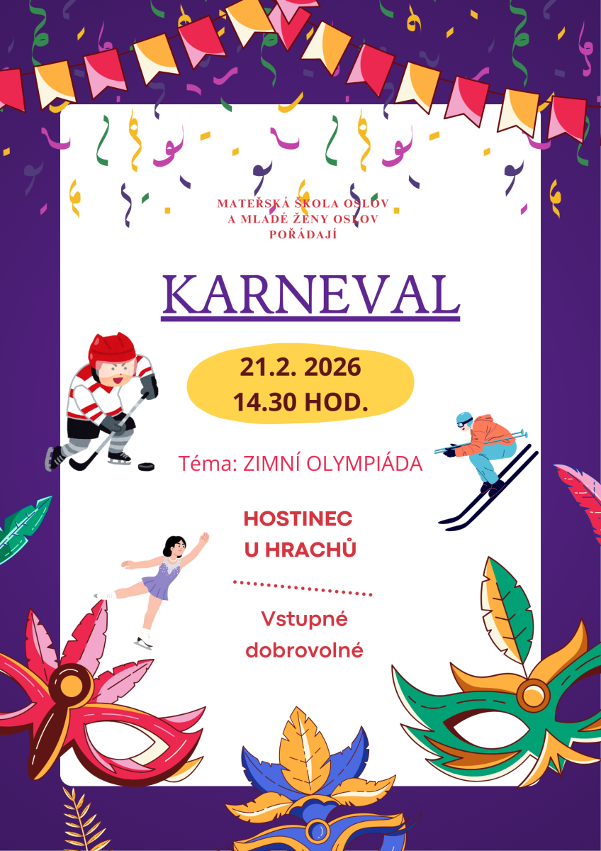 V sobotu 21.2.2026 pořádá MŠ Oslov ve spolupráci se spolkem Mladé ženy Oslov dětský karneval. Karneval se uskuteční v Hostinci U Hrachů od 14:30 hodin.