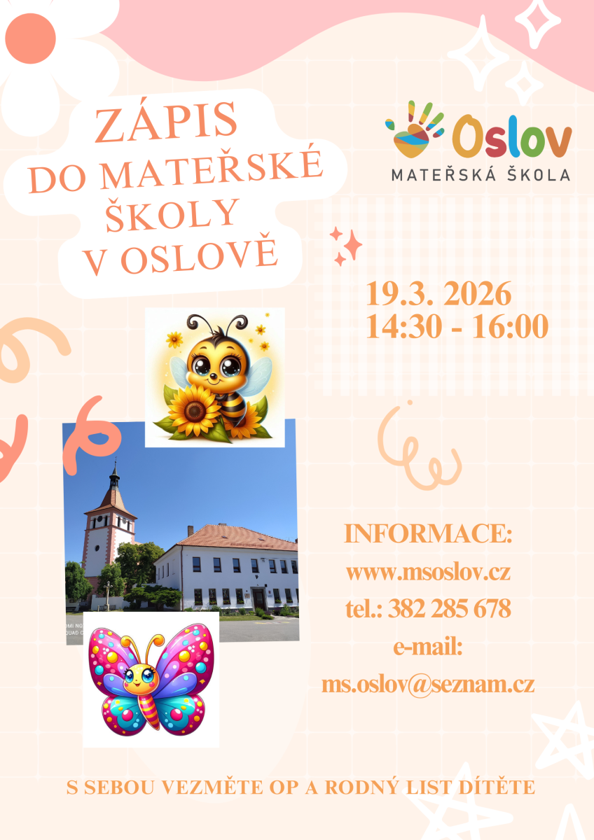 Zápis do MŠ Oslov proběhne 19.3.2026 od 14:30 do 16:00 hodin. S sebou vezměte OP a rodný list dítěte.